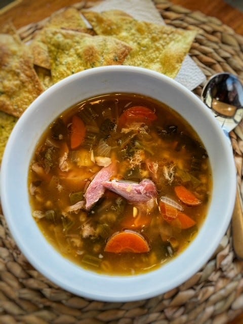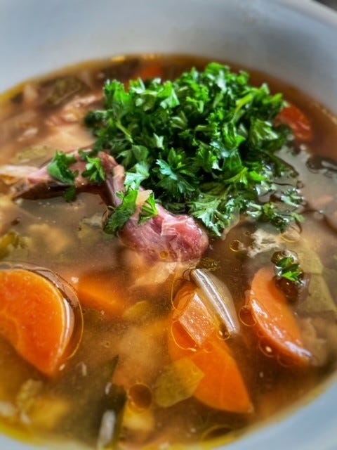 Remove the skin from the hock and discard and then shred the meat and return it to the soup.