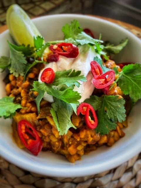 Once the lentils have reached the desired doneness and texture add chopped silver beet, lime juice and adjust for seasoning and heat and serve over rice.